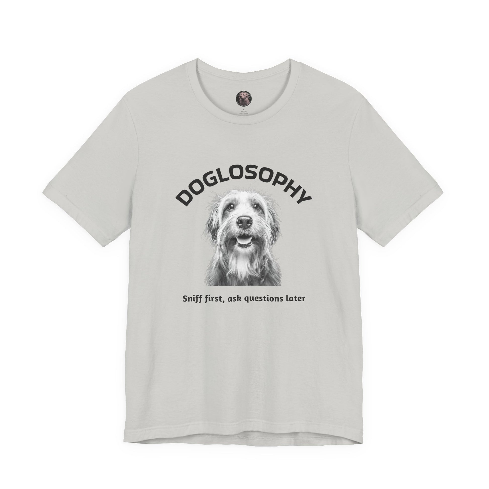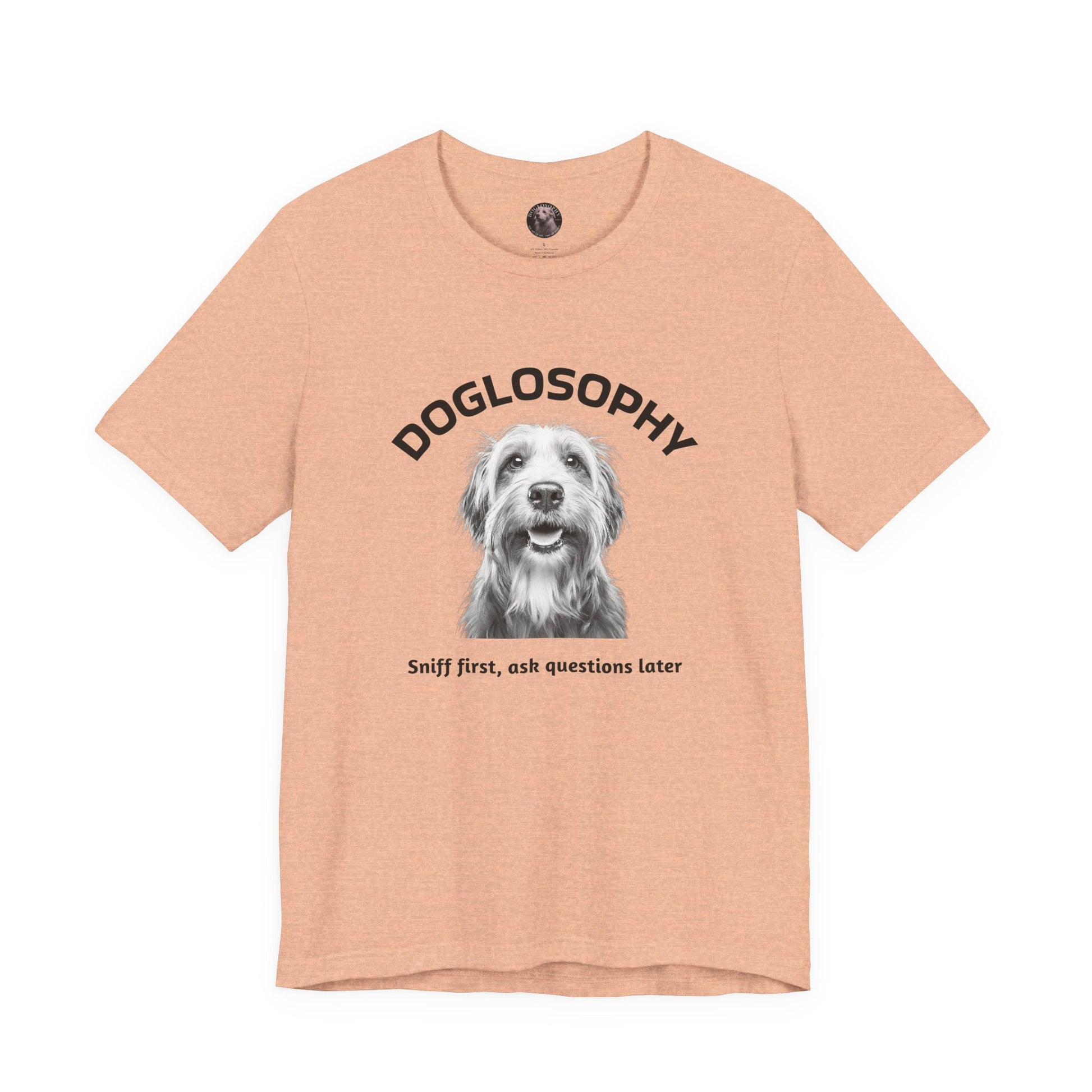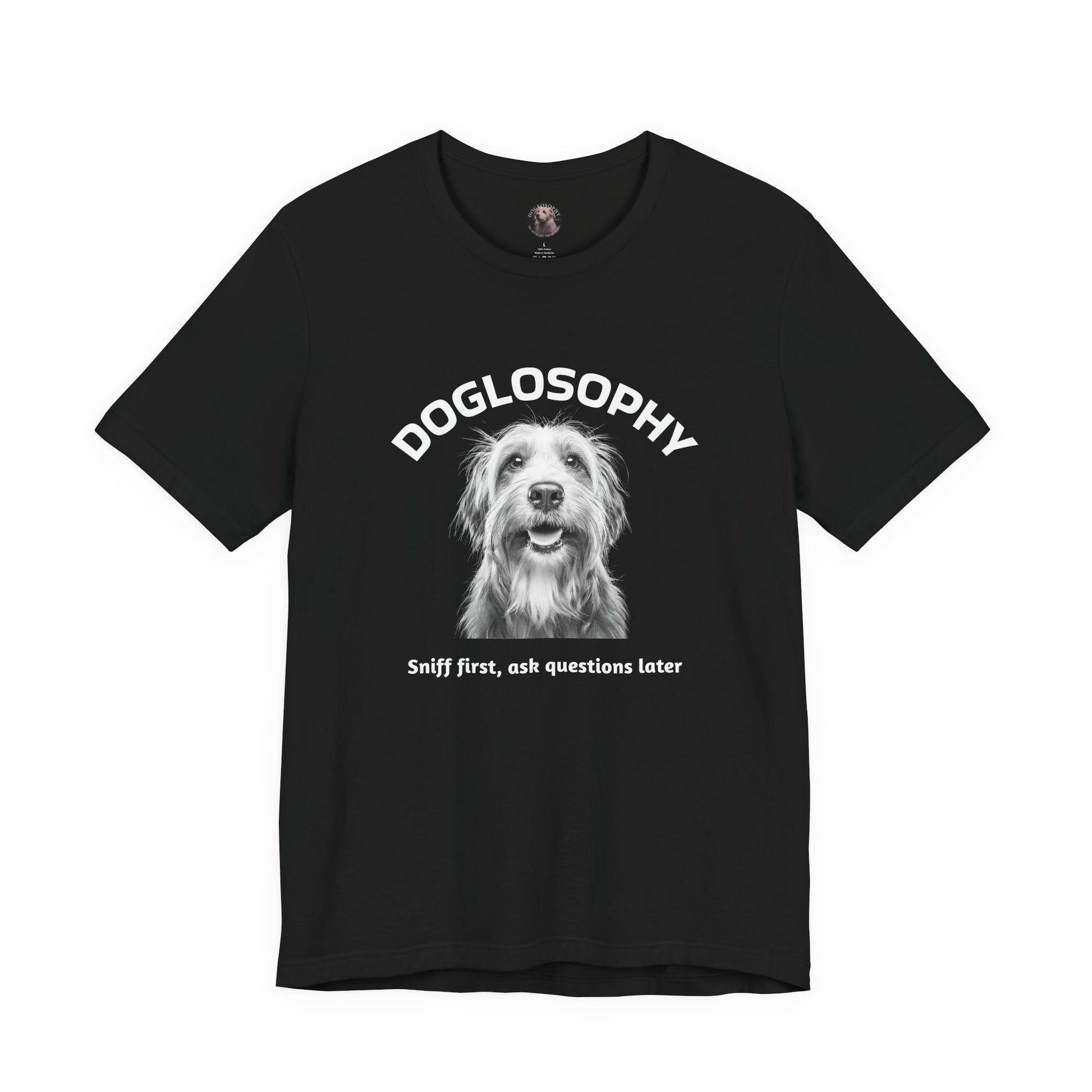 Maglietta a maniche corte unisex Doglosophy – Design "Prima annusa, poi fai domande"